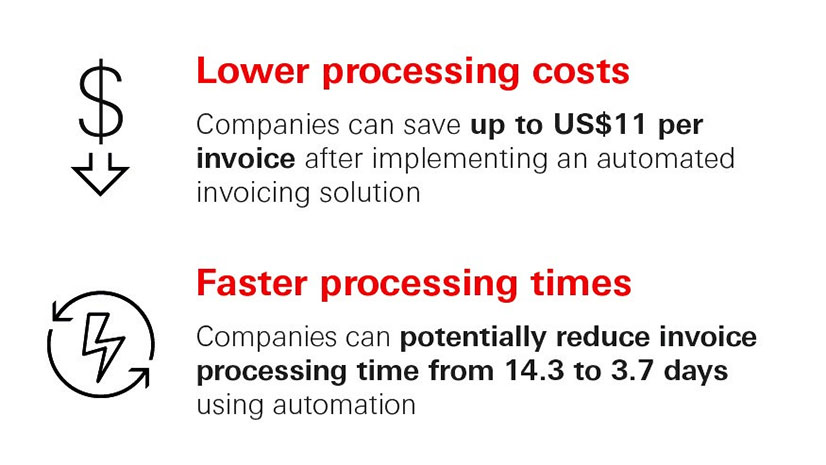 The shift from paper to electronic invoices might not sound like a big difference, but the removal of manual processes is a real cost saver. Companies can save US$11 per invoice after implementing an automated invoicing solution, due to lower processing costs1 while automation reduces the invoice processing time from 14.3 days to just 3.7 days 2. For a sizeable company processing a large number of transactions, these benefits add up to meaningful savings, as the treasury becomes more efficient at completing a growing number of payments.